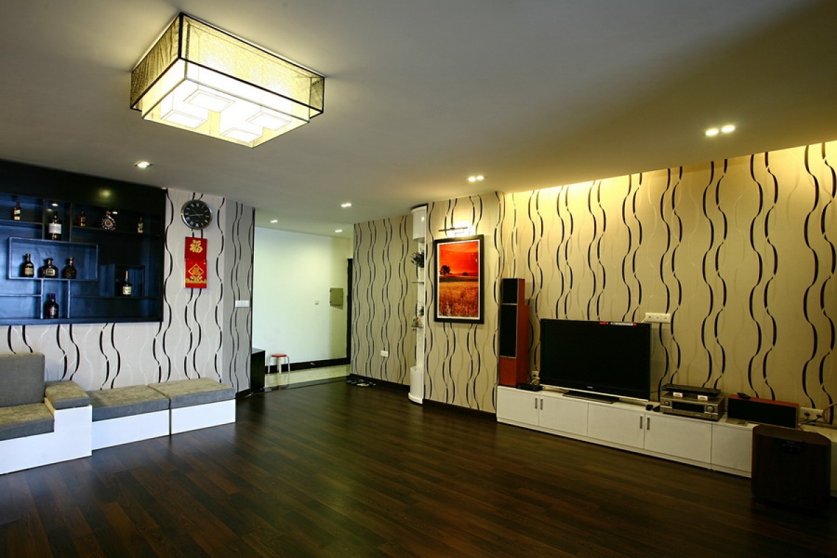 Sử dụng giấy dán tường làm tăng hiệu quả thẩm mỹ và thị giác: Những hoa văn sọc đứng “kéo” chiều cao của trần lên, trong một không gian rộng của căn hộ chung cư với trần thấp.